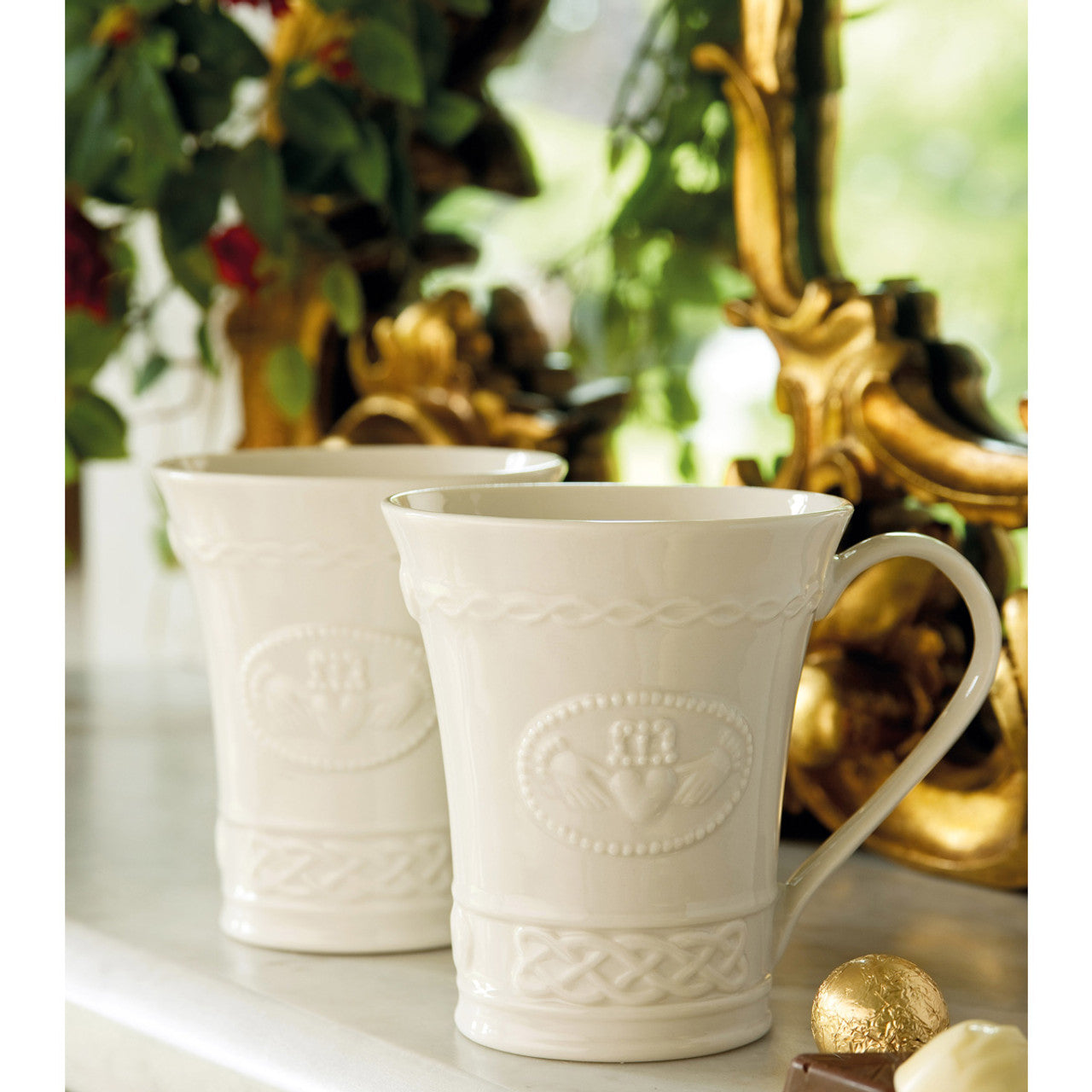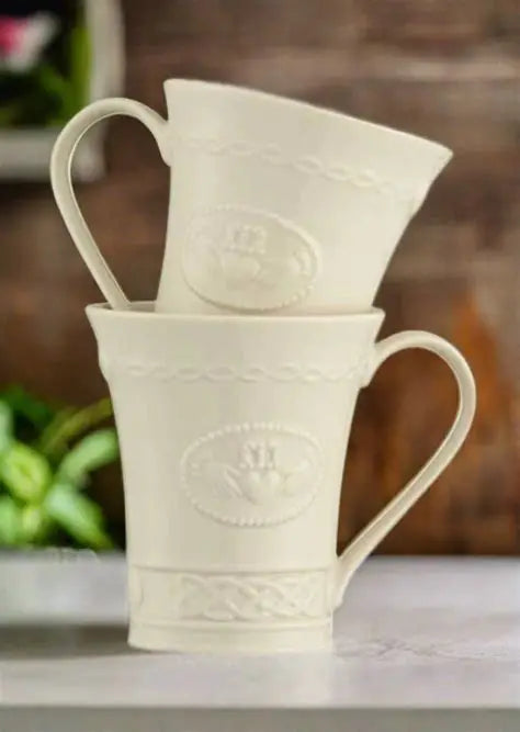 The Belleek Claddagh collection is inspired by the history of the Claddagh which goes back over four hundred years when a Spanish goldsmith fell in love with a girl from the Claddagh village. He crafted the first Claddagh ring for her. Since then the Claddagh ring has become a token of love throughout the world. Its symbols of a heart under a crown held by hands represent love, friendship and loyalty.This pair of beautiful Belleek Claddagh Mugs are handcrafted in Belleek and feature an embossed Claddagh design, symbolising Love, Friendship and Loyalty. Perfect for an engagement or Anniversary gift.
