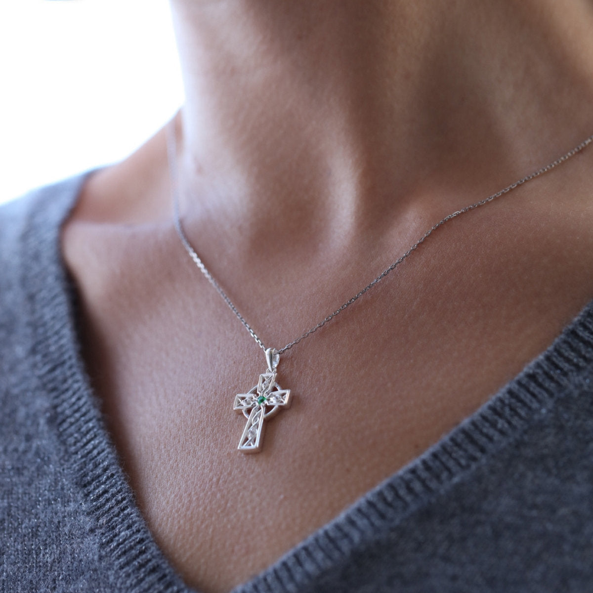 This striking sterling silver cross pendant features a synthetic emerald at the center, as well as cubic zirconia. Crosses are a powerful symbol of faith, and this one is boldly engraved with Celtic knot-work symbolizing eternal life and endless love. The outer circle also represents eternity. This sterling silver pendant with Cubic Zirconia has been Irish hallmarked in Dublin Castle.
