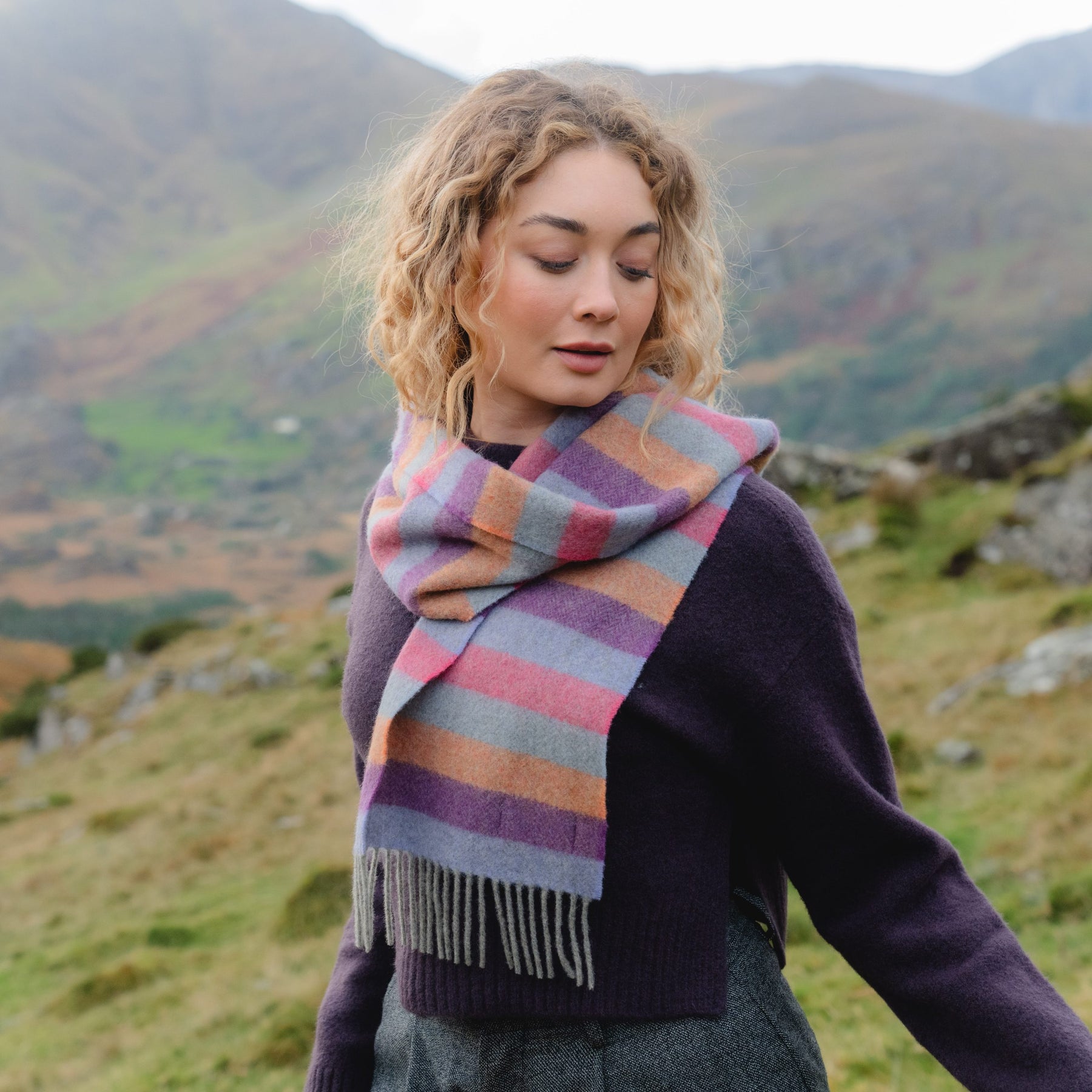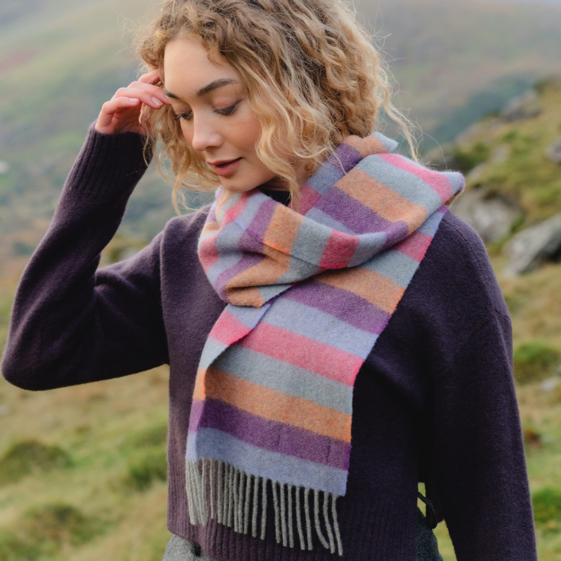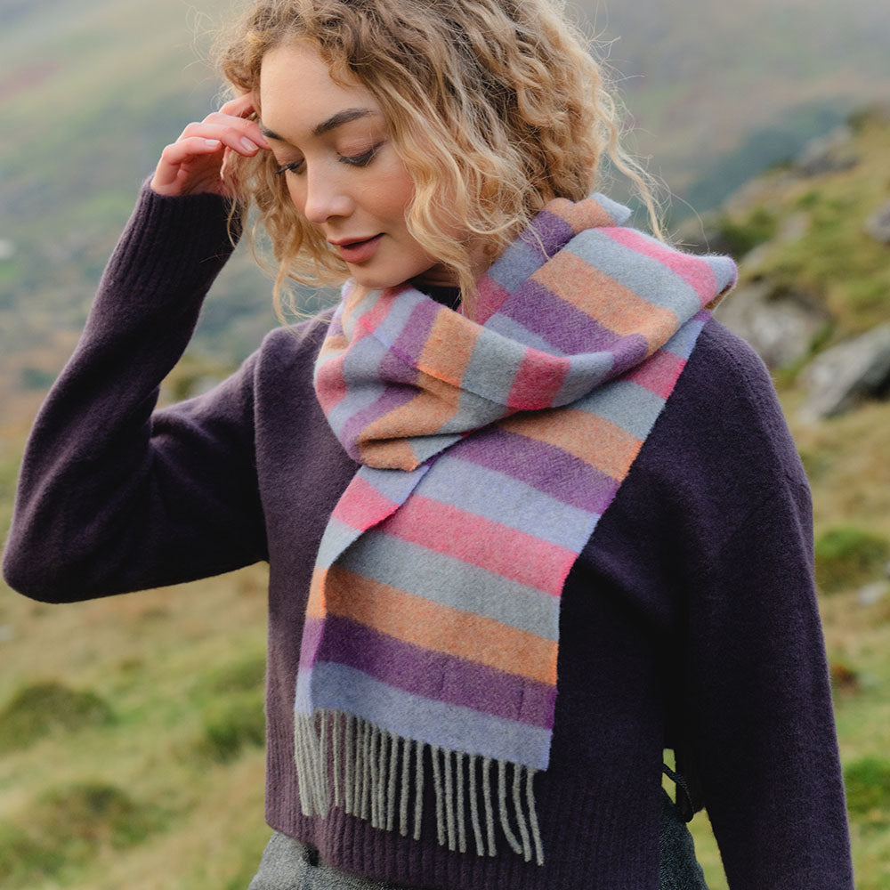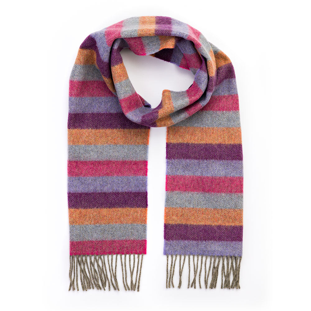 Irish Wool Scarf Long Purple Orange Pink Stripe Herringbone.