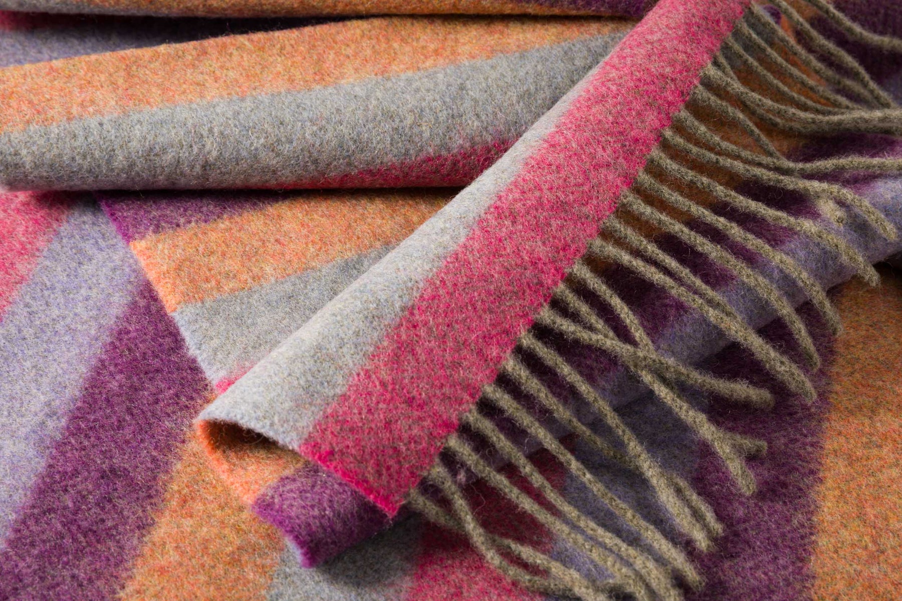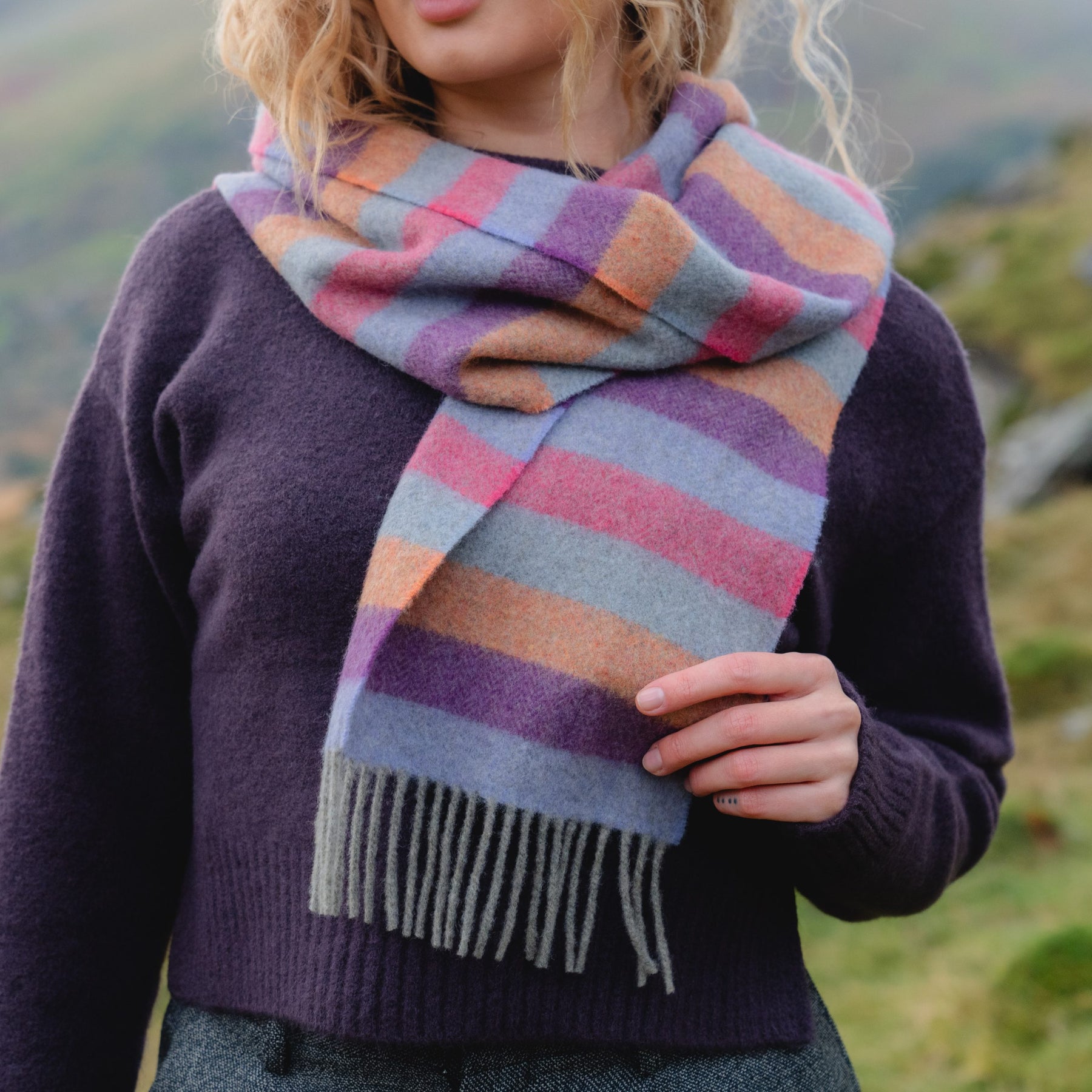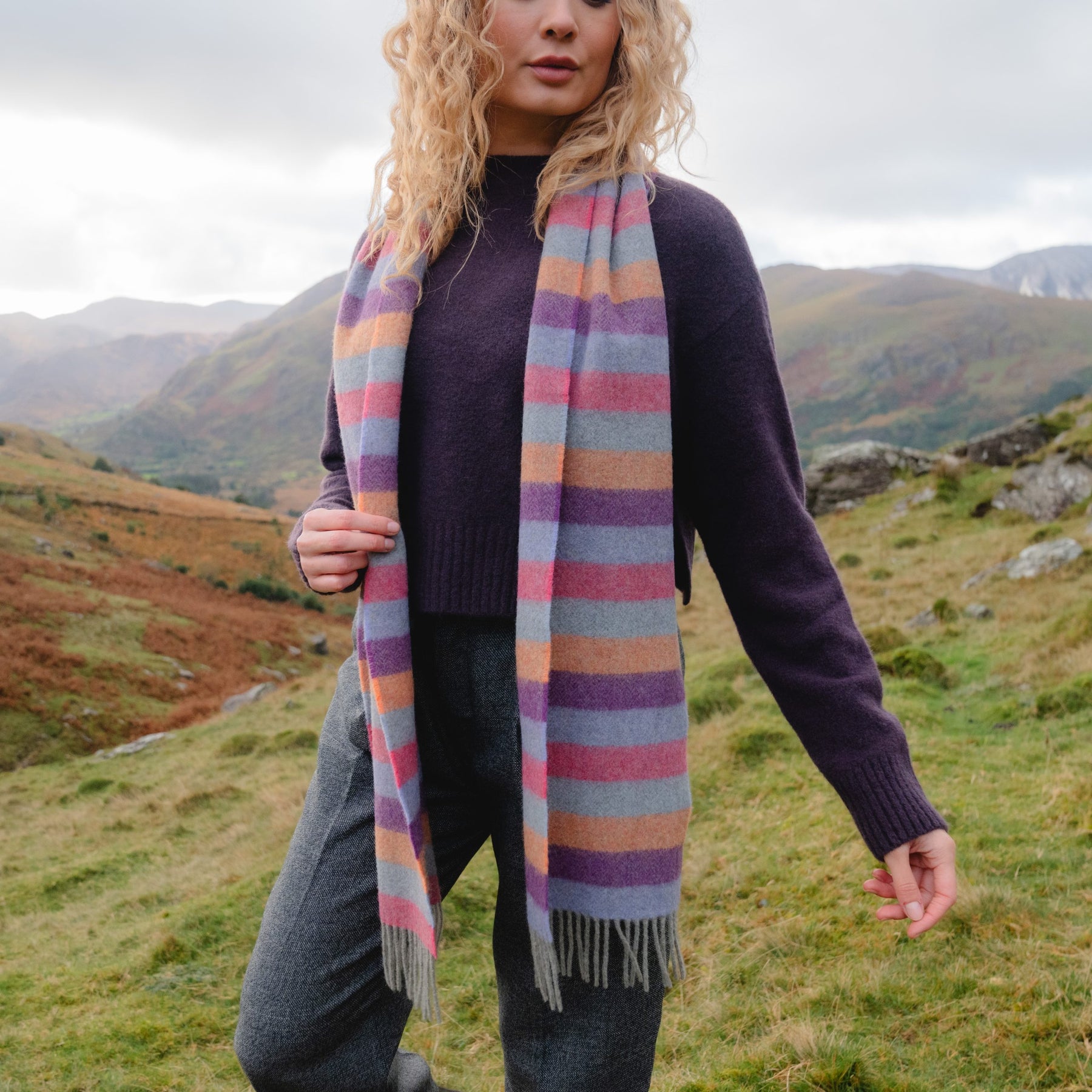 Irish Wool Scarf Long Purple Orange Pink Stripe Herringbone.