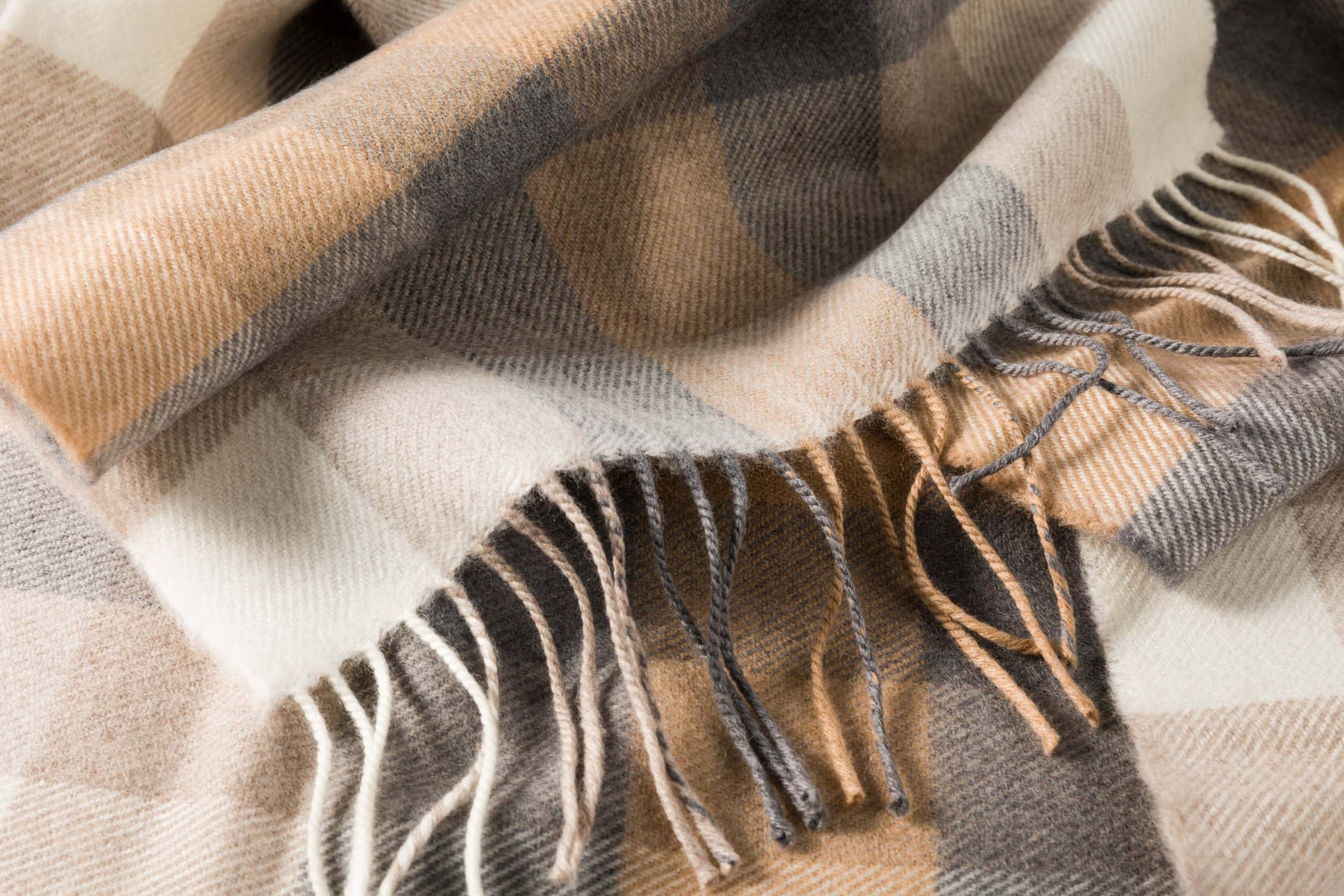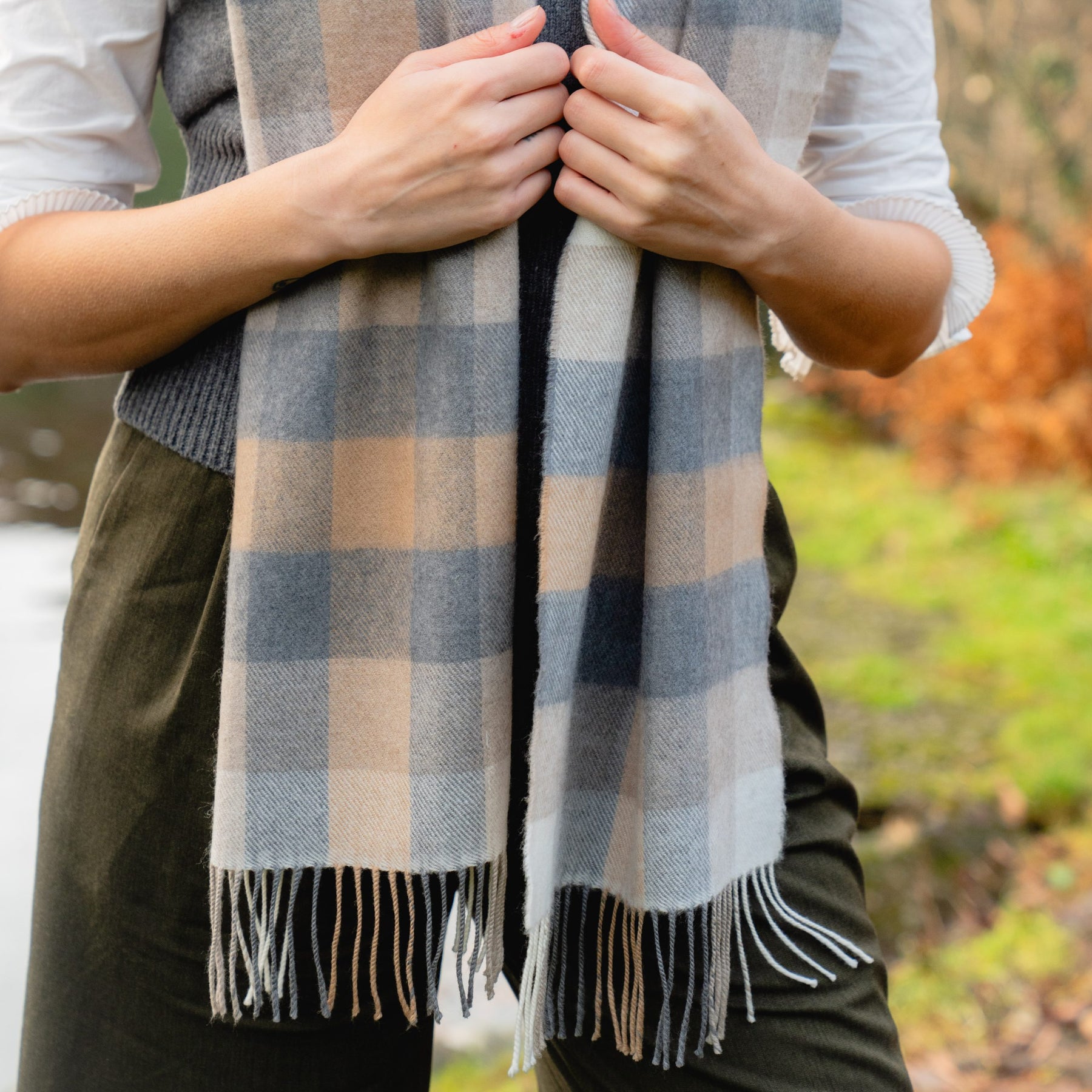 Merino Luxury Wool Scarf Camel Grey Stone White Block Check