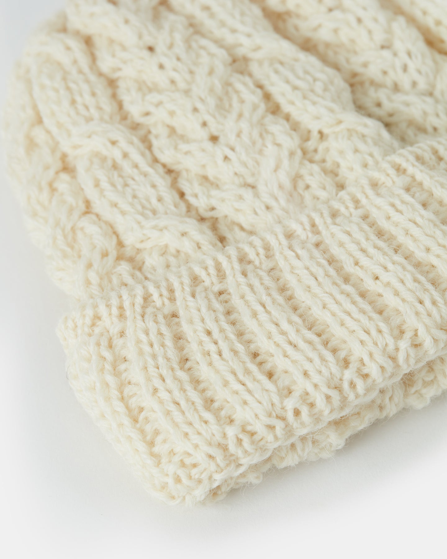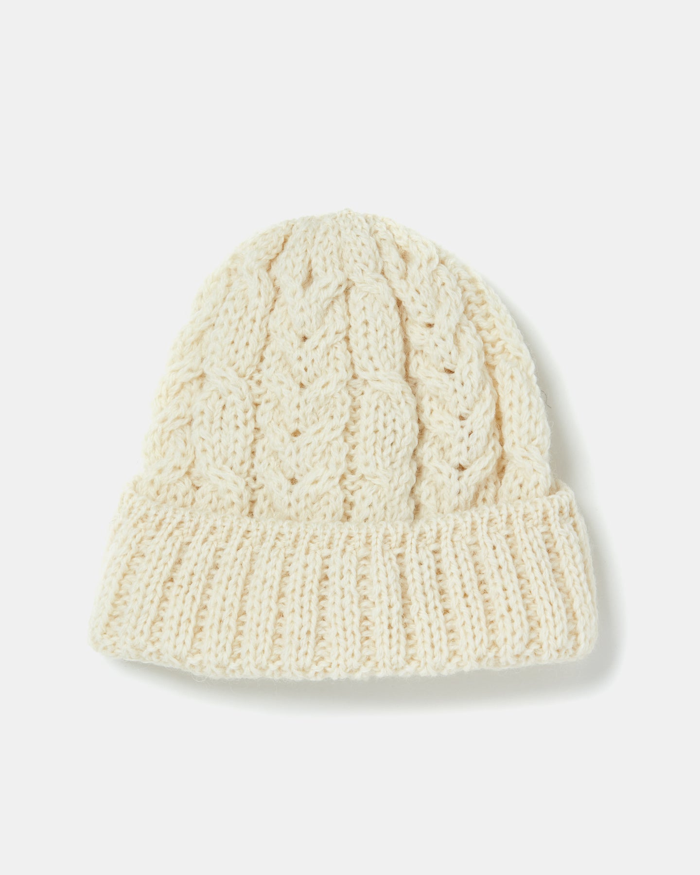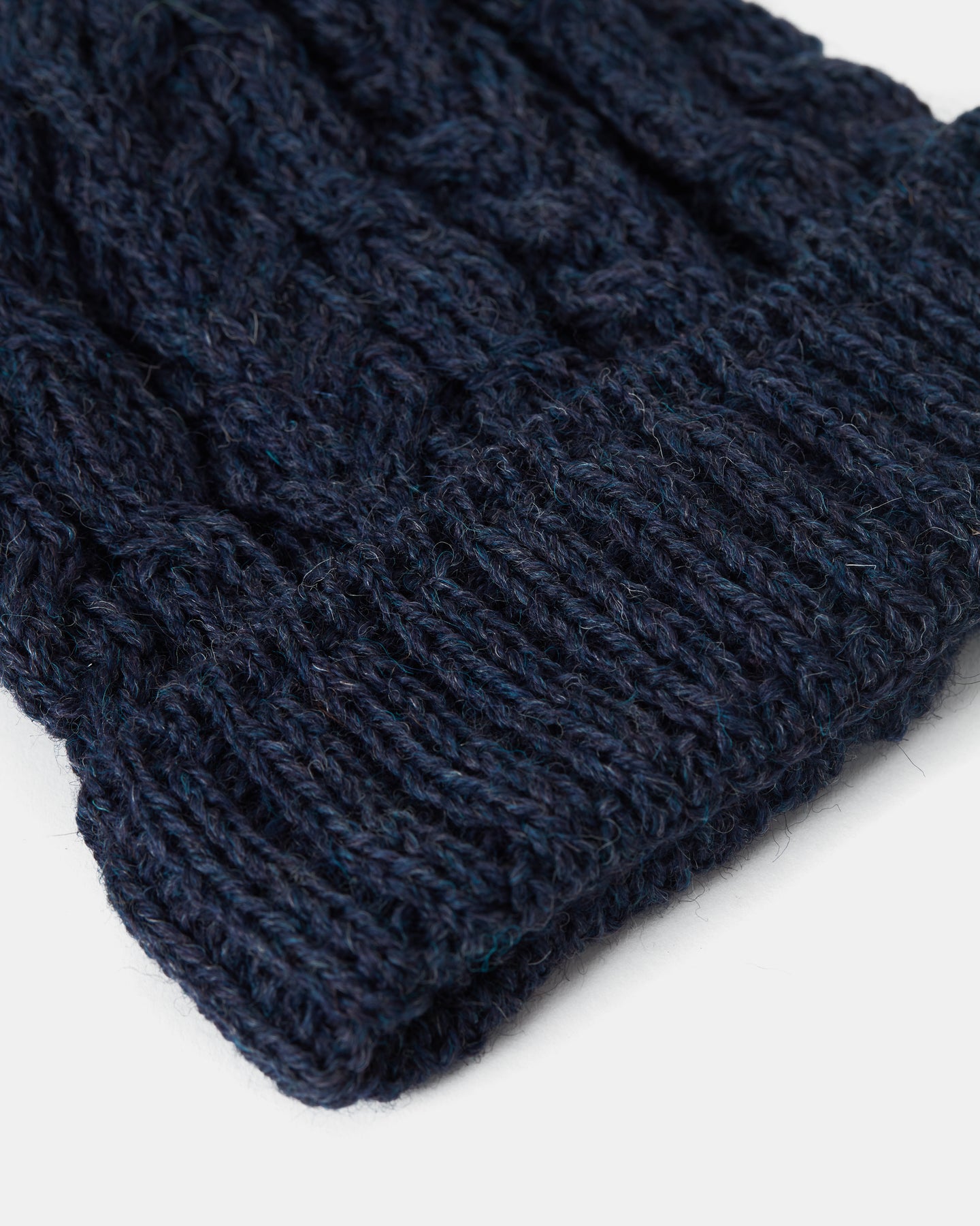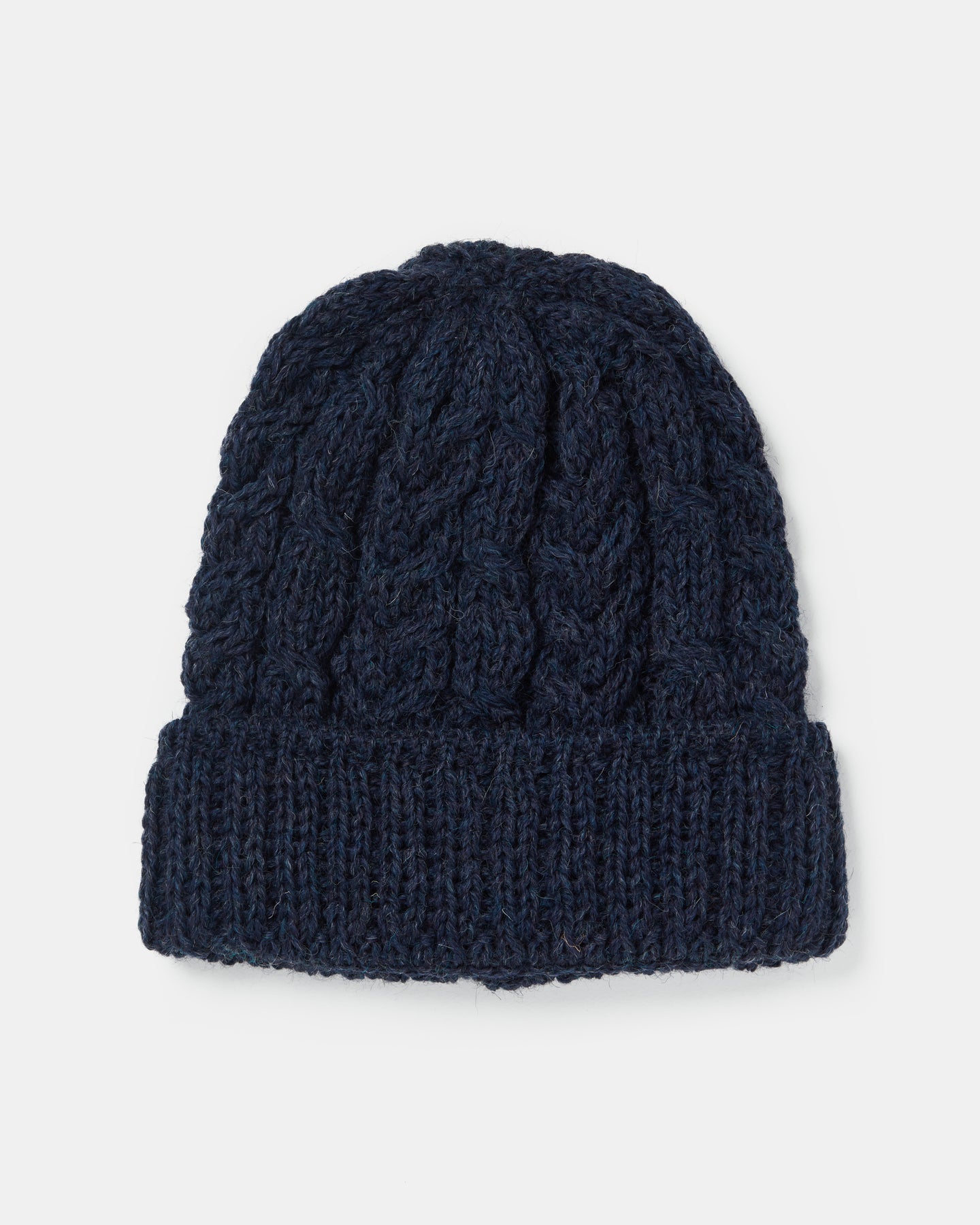 A lighter weight everyday Aran hat featuring mirrored and elongated cables with a 2x2 ribbed turn up for a snug fit. 100% wool.