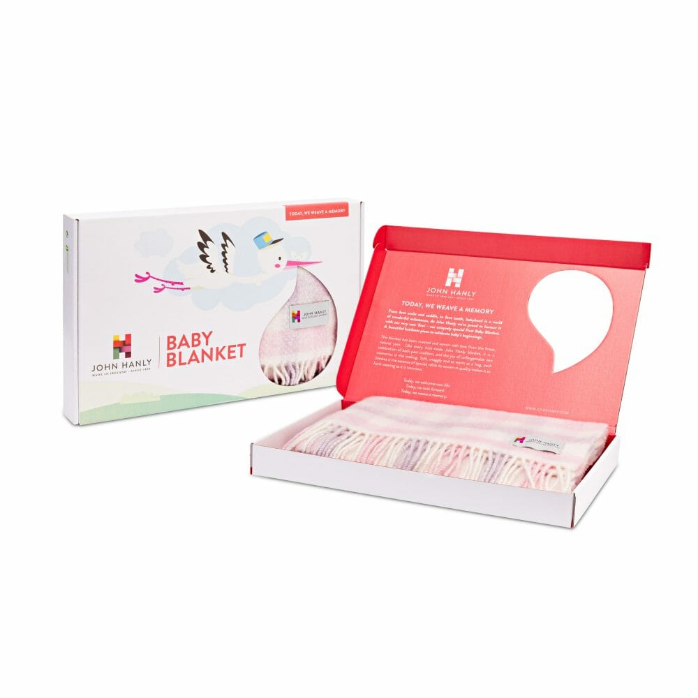 Irish Cashmere Baby Blanket Baby Pink and Lilac Block Check. A gorgeously soft cashmere blend baby blanket, a beautiful heirloom celebrating baby’s beginnings, comes in a specially designed gift box. 95% Merino Wool 5% Cashmere.