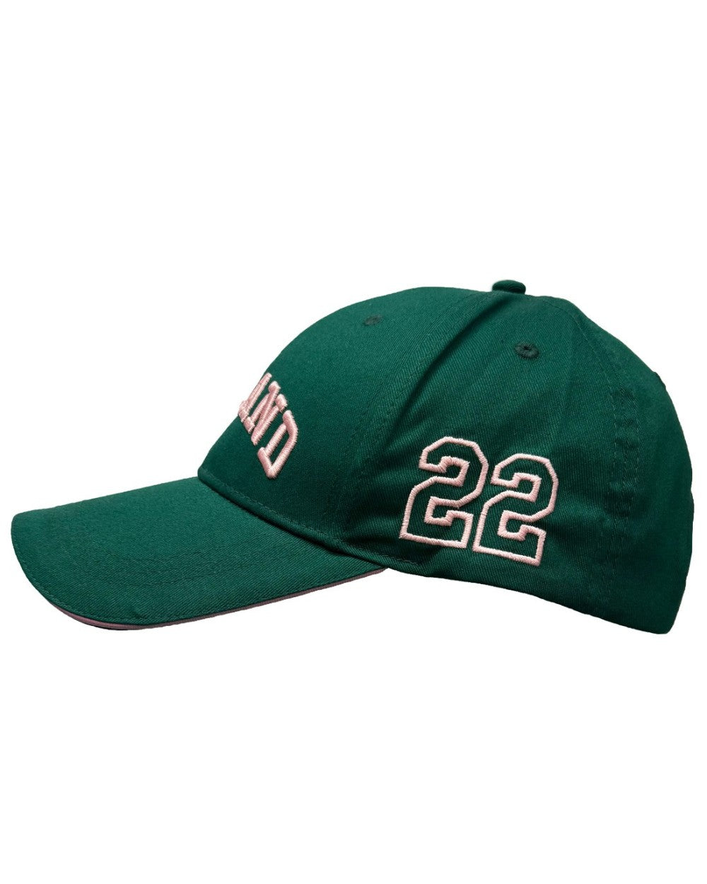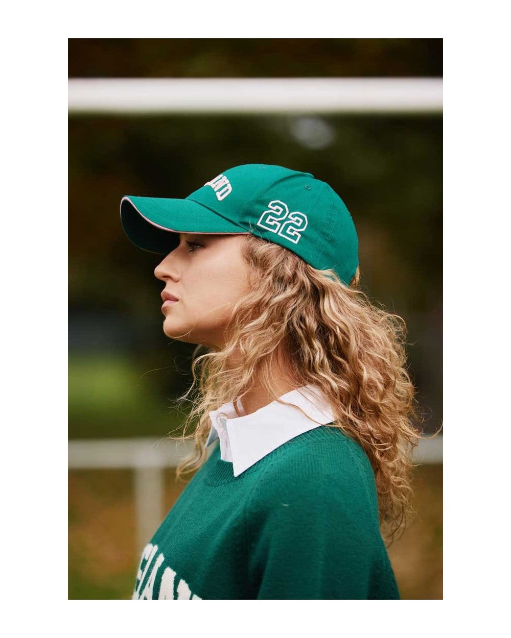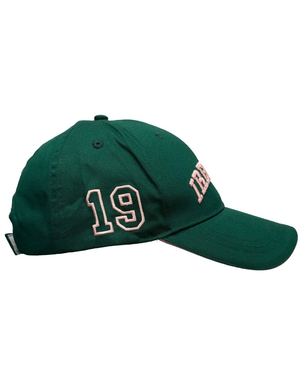 A bold baseball cap combining evergreen and pink tones. Classic shape with modern color contrast. Ideal for casual outfits.